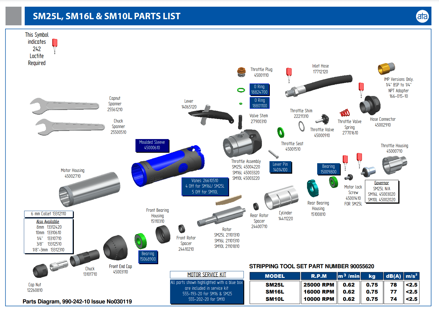 Hastighed (rpm) 10,000 Effekt: (hk) 1.10 Effekt: (watt) 820 Vægt 0,730 kg Længde: 213 mm Højde: 40 mm Luftforbrug: 0.62 (m3/min) Luftforbrug: (cfm) 21.89 Støjniveau (da.(A)) 77 Standard spændestørrelse: 6 mm Spænde niveauer: 3/8/10 Spændetype: CA Type Luftudtag: Bag Håndtag type: Sikkerhedsgreb