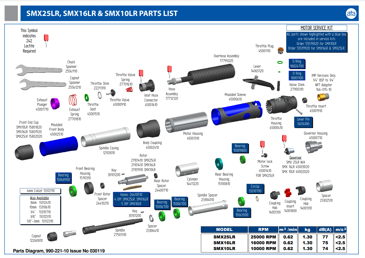 Hastighed (rpm) 10,000 Effekt: (hk) 1.10 Effekt: (watt) 820 Vægt 1,300 kg Længde: 345 mm Højde: 40 mm Luftforbrug: 0.62 (m3/min) Luftforbrug: (cfm) 21.89 Støjniveau (da.(A)) 74 Standard spændestørrelse: 6 mm Spænde niveauer: 3/8/10 Spændetype: CA Type Luftudtag: Bag Håndtag type: Sikkerhedsgreb
