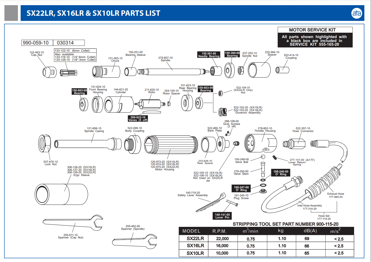 Hastighed (rpm) 16,000 Effekt: (hk) 0.85 Effekt: (watt) 630 Vægt 1,170 kg Længde: 320 mm Højde: 40 mm Luftforbrug: 0.85 (m3/min) Luftforbrug: (cfm) 30.01 Støjniveau (da.(A)) 65 Standard spændestørrelse: 6 mm Spænde niveauer: 3 Spændetype: CB Type Luftudtag: Bag Håndtag type: Sikkerhedsgreb