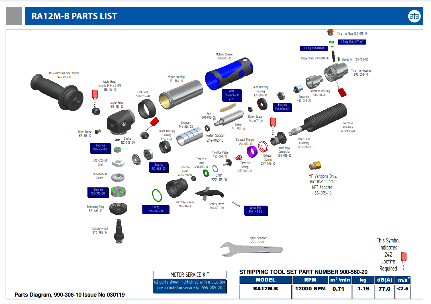 Hastighed (rpm) 12,000 Effekt: (hk) 0.90 Effekt: (watt) 0.675 Vægt 1,810 kg Længde: 215 mm Højde: 95 mm Luftforbrug: 0.71 (m3/min) Luftforbrug: (cfm) 25.07 Støjniveau (da.(A)) 77 Standard spændestørrelse: N/A mm Spænde niveauer: N/A Spændetype: N/A Luftudtag: Bag Håndtag type: Sikkerhedsgreb Spindeltråd: N/A Auto-balancer: Ja Sidehåndtagstype: A