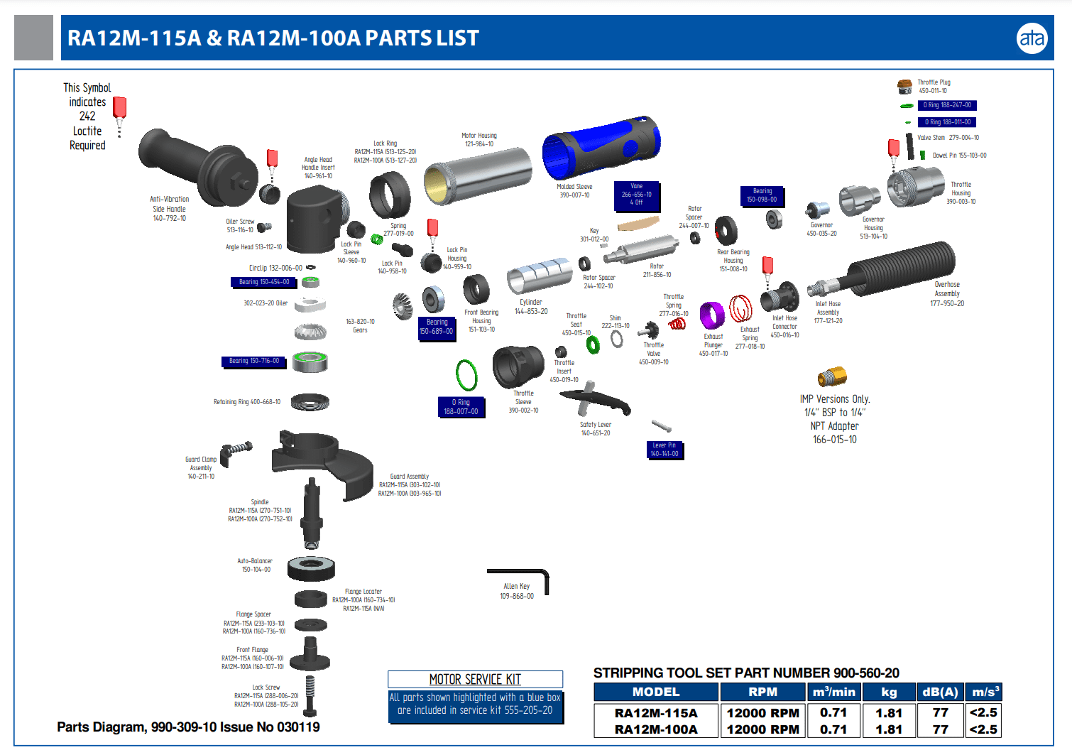 Hastighed (rpm) 12,000 Effekt: (hk) 0.90 Effekt: (watt) 0.675 Vægt 1,810 kg Længde: 215 mm Højde: 88.50 mm Luftforbrug: 0.71 (m3/min) Luftforbrug: (cfm) 25.07 Støjniveau (da.(A)) 77 Standard spændestørrelse: N/A mm Spænde niveauer: N/A Spændetype: N/A Luftudtag: Bag Håndtag type: Sikkerhedsgreb Spindeltråd: 5/8”-11 UNC Auto-balancer: Nej Sidehåndtagstype: A