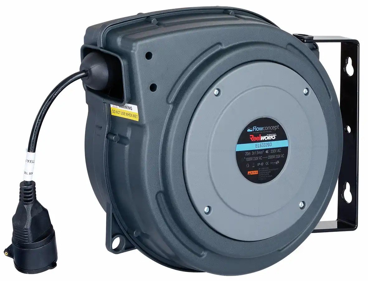 Kasse fremstillet i holdbart-polypropylen med roterbart væg- eller loftbeslag. Kablet låses automatisk ved den ønskede længde. IP-klassificering: 42. Kabel længde: 20 mtr. Maks. belastning udrullet: 2000W. Maks. belastning indrullet: 1000W. Antal ledere: 3. mm2: 1,5. Kabeltype: PVC. Opruller materiale: Plast. Vægt 7,000 kg