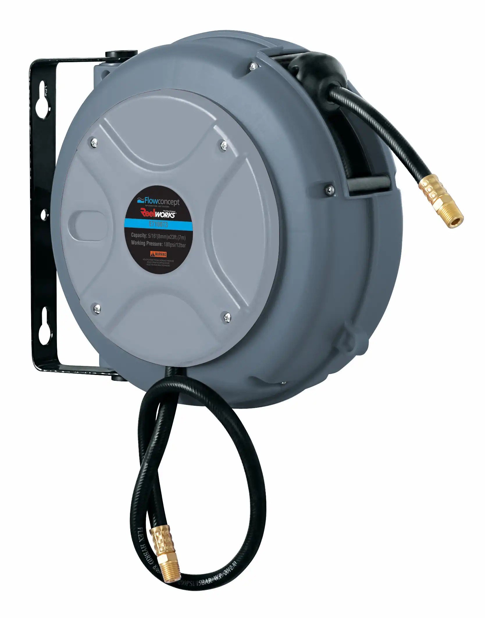 Slangeopruller fra standardserien, prisvenlig og ideel til almindelig brug. Kassen er fremstillet af slagfast polypropylen med et drejeligt væg- eller loftbeslag. Slangen låses automatisk ved den ønskede længde og er monteret med en armeret PUR-slange. Tilslutning: 3/8" udvendigt gevind. Slange længde: 7 mtr. Dimension: 3/8”. Indgang: 3/8” i.g. Udgang: 3/8” u.g. Materiale: Plast. Maks. tryk: 20 bar. Vægt 5,000 kg.