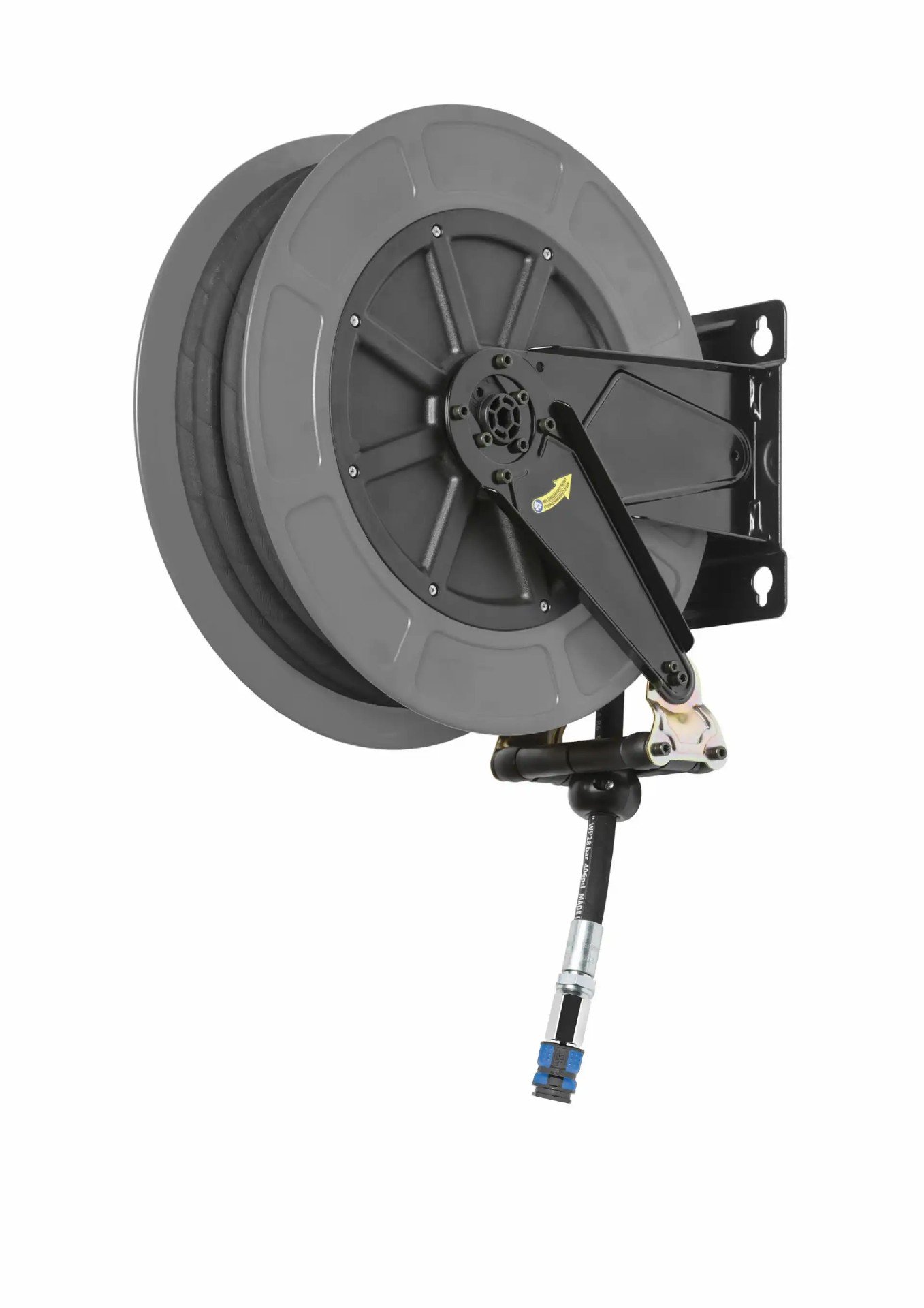 Denne serie er produceret i stål med en kraftig epoxy pulverlakering som er meget modstandsdygtig. Siderne er lavet i ABS slagfast plast, som mindsker vægten men stadig er særdeles robust. Slange længde: 15 m. Dimension: 3/8” Liter / min.: 670 Materiale: Plast Maks tryk: 20 bar Udgnag: 3/8” u.g. Pakning: Viton Svivel: Messing Medie: Luft Vægt 12,000 kg.