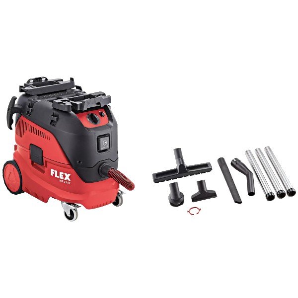 Den højtydende turbine sørger for stor luftmængde og stort undertryk Den indbyggede stikdåse, som enten kan give permanent strøm, eller bruges som start/stop automatik til støvsugeren Med indbygget overvågning af det fornødne vakuum i støvsugeren, som med både lyd og lysblik melder, hvis filteret skal renses = mindre luftstrøm end 20m./sek. Trinløs vakuumregulering af luftmængden, til f.eks. finslibning Ved vådsugning: med elektronisk væskemængde overvågning Langsom opstart af støvsugeren forhindrer at sikringer springer ved opstart 15 sek. efterløb tømmer maskine og slange for støv Udstyret med store hjul og to drejelige styrehjul af metal Med 4 spændeløkker (2 på hver side) til fastgørelse af stropper og en girafholder Nemt at udskifte filter Optagen effekt: 1.200 W Maks. volumen flow: 4,500 (l/min). Maks. vacuum: 25.000 Pa Filteroverflade: 5.000 m2 Beholdervolumen: 30 liter Påfyldningsmængde/væske: 17 liter Filter rengrøring: Automatisk filterrensning Støvklasse: L Slangelængde: 4 m Ledninglængde: 7,5 m Stikdåse: 100-2.400 W Dimensioner (BxLxH): 565 x 385 x 565 mm Vægt 15,200 kg Leveringsindhold: 1× Antistatisk støvsugerslange SH-C 32x4m AS/NL 1× L-BOXX® holder VCE-AP 1× PES fladt foldet filter FE VCE PES L/M/H 1× Vliespose FS-F VCE 33-44 L/M VE5 1× Plastpose ES-PP VCE L/M VE5 1× Adapter SAD-C D25-32 AS 1× Rengøringssæt CLE 32 AS 2× Slangeklemme