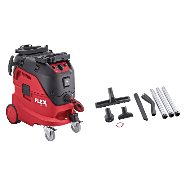 Den højtydende turbine sørger for stor luftmængde og stort undertryk Den indbyggede stikdåse, som enten kan give permanent strøm, eller bruges som start/stop automatik til støvsugeren Med indbygget overvågning af det fornødne vakuum i støvsugeren, som med både lyd og lysblik melder, hvis filteret skal renses = mindre luftstrøm end 20m./sek. Trinløs vakuumregulering af luftmængden, til f.eks. finslibning Ved vådsugning: med elektronisk væskemængde overvågning Langsom opstart af støvsugeren forhindrer at sikringer springer ved opstart 15 sek. efterløb tømmer maskine og slange for støv Udstyret med store hjul og to drejelige styrehjul af metal Med 4 spændeløkker (2 på hver side) til fastgørelse af stropper og en girafholder Nemt at udskifte filter Optagen effekt: 1.200 W Maks. volumen flow: 4,500 (l/min). Maks. vacuum: 25.000 Pa Filteroverflade: 5.000 m2 Beholdervolumen: 42 liter Påfyldningsmængde/væske: 26 liter Filter rengrøring: Automatisk filterrensning Støvklasse: H Slangelængde: 4 m Ledninglængde: 7,5 m Stikdåse: 100-2.400 W Dimensioner (BxLxH): 565 x 385 x 650 mm Vægt 17,600 kg 1× Antistatisk støvsugerslange SH-C 32x4m AS/NL 1× L-BOXX® holder VCE-AP 1× PES fladt foldet filter FE VCE PES L/M/H 1× Filterelement FE VCE44 H/HEPA 1× Sikkerhedsfiltersæk SFS VCE H VE5 1× Adapter SAD-C D25-32 AS 1× Rengøringssæt CLE 32 AS 2× Slangeklemme