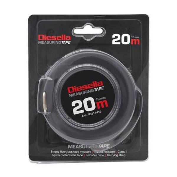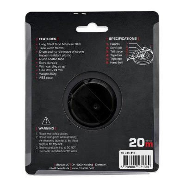Leveres inkl. bærestrop. Bredde: 10mm Klasse: 2 Kompakt og slagfast hus og tromle (BxLxH): 99x99x24mm Praktisk holder til krog Sammenklappelig krog Bærestrop Bånd farve: Gul Forpakning: 1 Gradering: MM Gummibelagt hus: Nej Længde: 20000mm Lock: Nej Magnet: Nej Vægt 0,310 kg