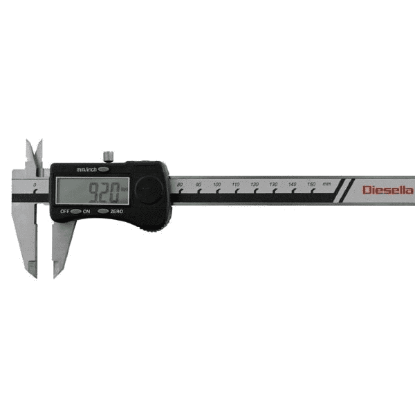Standard digital skydelære i rustfrit stål. Måleområde fra 0-150 mm med 0,01 mm aflæsning og kæbelængde på 40 mm. Funktioner: Manuel on/off, nulstilling, omskifter fra mm til tommer, fladt dybdemål, mono-block (forlænger levetiden på skydelæren). Aflæsning: 0,01 mm Batteri: 1xLR44 Kæbelængde: 40 mm Måleområde: 0-150 mm Materiale: Rustfrit stål Nøjagtighed: ± 0,03 mm Produkt type: Digital skydelære Brutto vægt 0,410 kg Netto vægt 0,160 kg