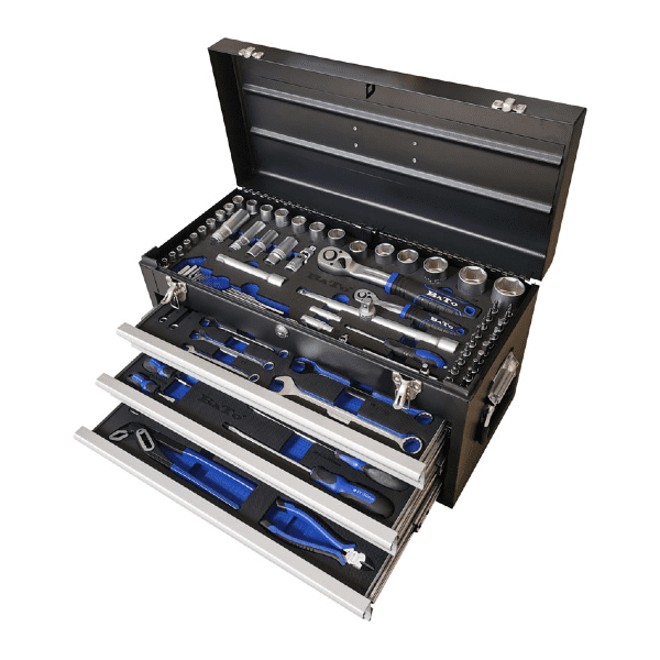 75 dele. 5 rums metalkasse mål 480x230x230mm. Alt ligger i EVA skum. Toppe kort 1/2" 8-9-10-11-12-13-14-15-16-17-18-19-21-22-24-27-30-32mm, Skraldenøgle 1/2" 72T, forlænger 1/2"x125mm 1/2" x 250mm, toppe korte 1/4" 4-4,5-5-5,5-6-7-8-9-10-11-12-13mm, forlænger 1/4"x75mm, skraldenøgle 1/4" 72T, ringgaffelnøgler 6-7-8-9-10-11-12-13-14-15-16-17-18-19-20-21-22-24mm, stiftenøglesæt 1,5-2-2,5-3-4-5-5,5-6-8-10mm, sideafbider 160mm, spidstang lige 160mm, vandpumpetang 250mm, skruetrækker 5,0x75 - 6,0x100 - 8,0x150 - Ph1x75 - Ph2x100 - Pz2x100mm, fiberhammer 1000g. Højde 340 mm - Længde 516 mm - Bredde 230 mm Vægt 17,000 kg