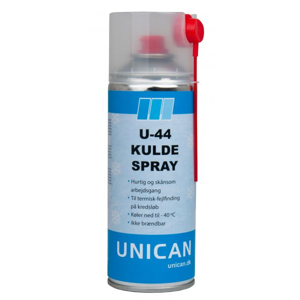 U-44 Kuldespray er et ikke-brændbart produkt, som effektivt og hurtigt bruges når der skal findes fejl på termiske kredsløb. Periodiske kort-slutninger, forstyrrelser i kondensatorer, mod-stande og integrerede kredsløb bliver hurtigt fundet ved brug af U-44 Kuldespray. Hurtig og skånsom arbejdsgang Til termisk-fejlfinding på kredsløb Køler ned til -40° Ikke brændbar Karton af 12 stk.