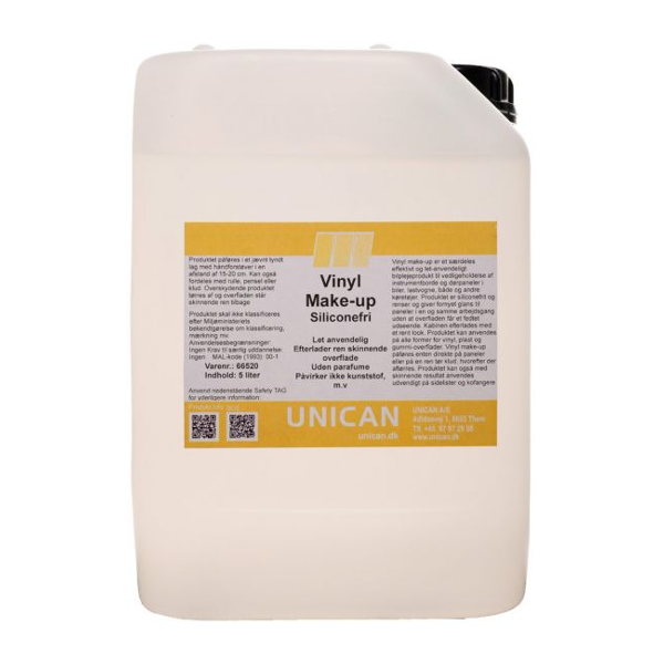 Unican Vinyl Make-up er et særdeles effektivt og let-anvendeligt bilplejeprodukt til vedligeholdelse af instrumentborde og dørpaneler i biler, lastvogne, både og andre køretøjer. Produktet er siliconefrit, det renser og giver fornyet glans til paneler i en og sammen arbejdsgang uden at overfladen får et fedtet udseende. Kabinen efterlades med et rent look. Produktet kan anvendes på alle former for vinyl, plast og gummi-overflader. Let anvendelig Efterlader ren skinnende overflade Uden parfume Påvirker ikke kunststof mv. Sælges stykvis. Kan også fås som 500 ml Spray
