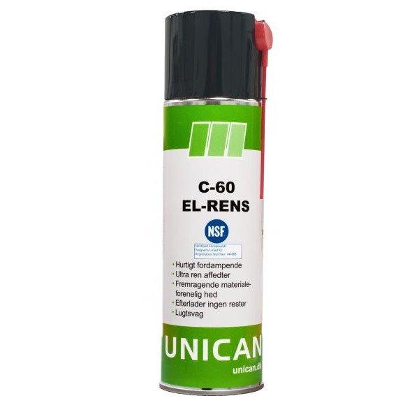 C-60 El-Rens er en ultra ren, lugtsvag, mild afrenser til f.eks. elektronik-industrien. C-60 El-Rens fjerner uden problemer snavs, fedt og støv på alt elektronisk udstyr. Hurtigt fordampende Ultra ren affedter Fremragende materialeforenelighed Efterlader ingen rester Lugtsvag Karton af 6 stk.