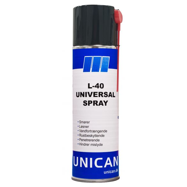 L-40 Universalspray er et 6 i en produkt, udviklet til at kunne løse mange forskellige opgaver overalt i industrien. Produktet indeholder fremragende smørende, rustopløsende, rustbeskyttende og fugtfortrængende egenskaber. L-40 Universalspray har en særdeles god penetrerende og beskyttende effekt, som gør den yderst effektiv til smøring af f.eks. kæder, tandhjul, gear, bremsedele, låse og alle andre former for bevægelige dele. Smører Løsner vandfortrængende Rustbeskyttende Penetrerende Hindrer mislyde Karton 6 stk.