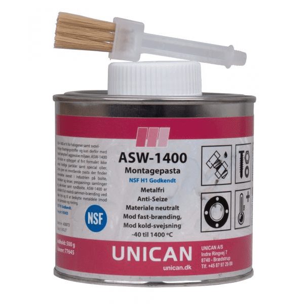 ASW-1400 Metalfri Montagepasta er opbygget af fint-formalet ikke metal holdige partikler, samt medicinsk olie. Produktet indeholder ikke metal-pigmenter som f. eks kobber, aluminium, nikkel, bly, zink m.v. Dette giver en enestående pasta, der finder anvendelse overalt i industrien på bolte, møtrikker og skruer, prespasningssamlinger og pak-skiver samt udliggere og rund-bolte. Metal fri Anti-Seize Materiale neutralt Modvirker ”stick-slip” Mod fastbrænding Mod kold-svejsning -40 til 1400 C NSF-H1 Godkendt Karton af 6 stk.