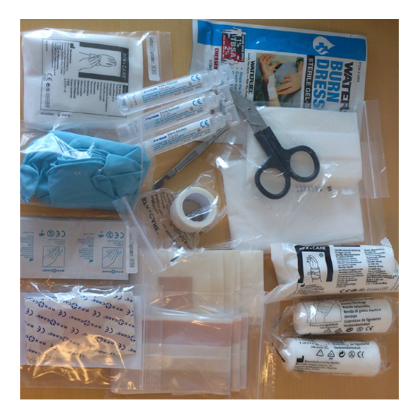 Indhold: 12 stk. renseservietter 4 stk. fingerplaster 7 x 7 cm. 1 stk. trekantet armklæde 136 x 96 x 96 cm. 1 stk. taperulle 5 m x 2,5 cm. 1 stk. sterilt kompres 17 x 17 cm. 2 stk. elastik bandage 4 m x 8 cm. 5 stk. kompres 5 x 5 cm. 3 stk. saltvandspipetter 9,9 ml. 1 stk. saks 12,7 cm. 1 stk. metal pincet 8,8 cm. 5 par handsker i pose størrelse 1 stk. elastik plaster 10 x 6 cm. 1 stk. indlægsseddel/manual. Tillagt Waterjel bandage.