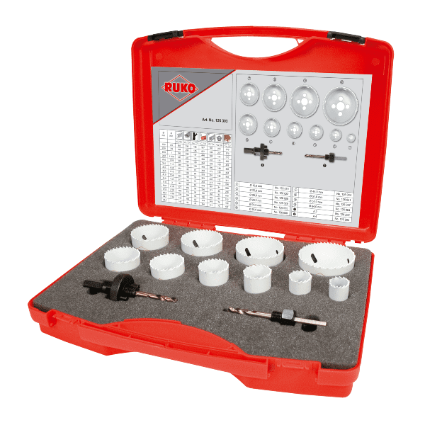 RUKO bimetal hulsave kan bruges i håndholdte og søjlebor. Til søjleboremaskiner, brug kun manuel fremføring. 12-delt bimetal hulsavsæt 10 hulsave Ø 19,0 - 22,0 - 25,0 - 29,0 - 35,0 - 38,0 - 44,0 - 51,0 - 57,0 - 64,0 m + 2 holdere A2 + A4 Materiale HSSE-Co 8 Skæreretning ret skæring Skæredybde 38.0 mm Kantvinkel fabriksstandard Vægt 1,950 kg
